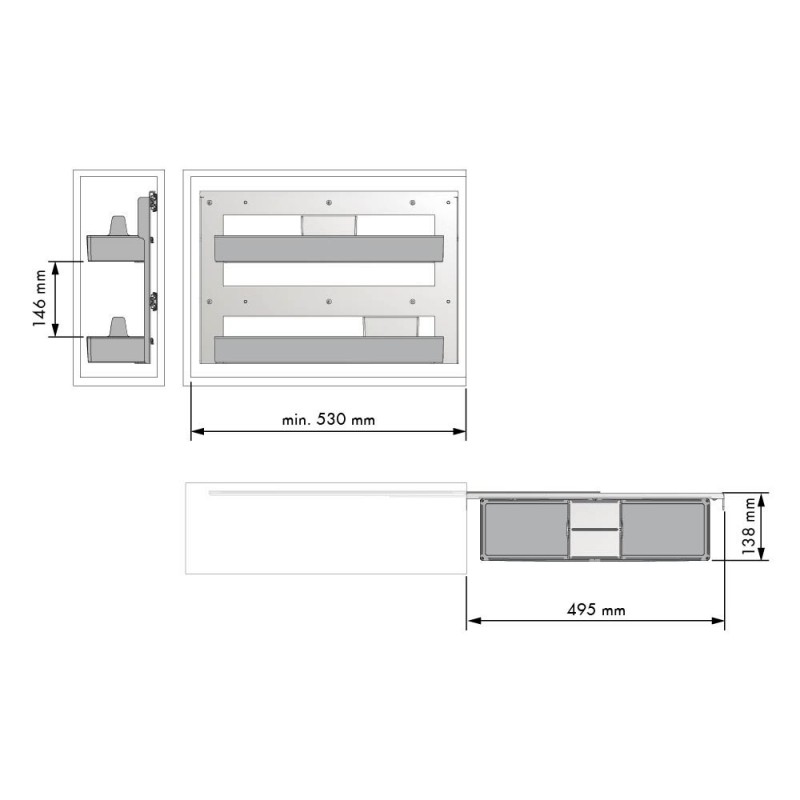 Accesorio despensero Nova Flat en acero acabado antracita y ABS, 2 estantes con bandejas removibles, guías laterales ocultas, extracción total y cierre amortiguado.