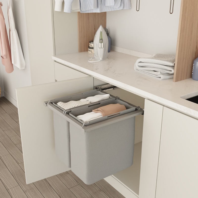 Tolva extraíble para muebles con puerta batiente con cestas de tela gris lavable y portable, guías de acero Hettich de extracción total y cierre amortiguado.