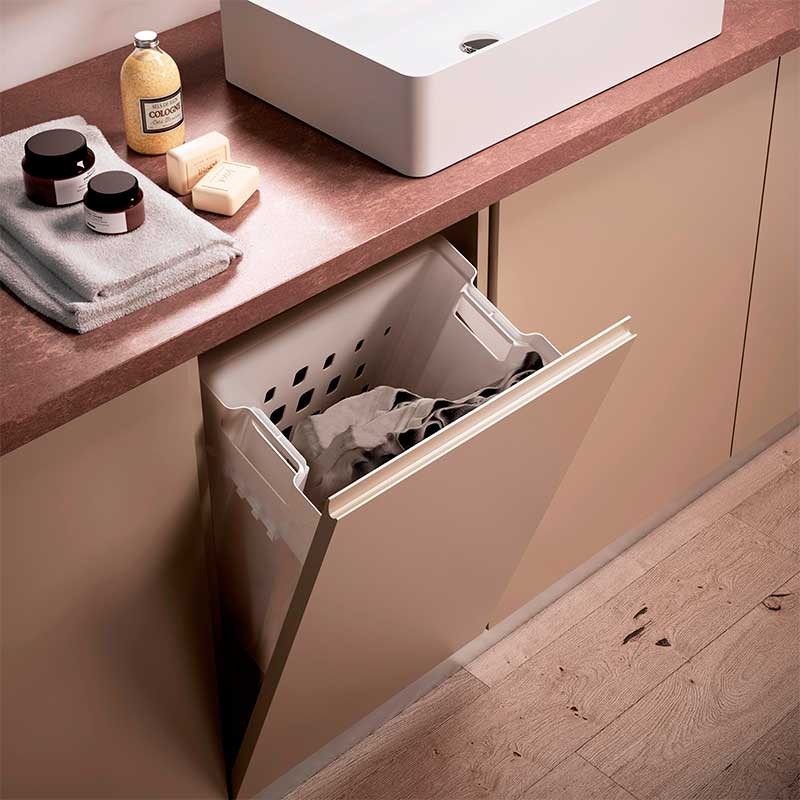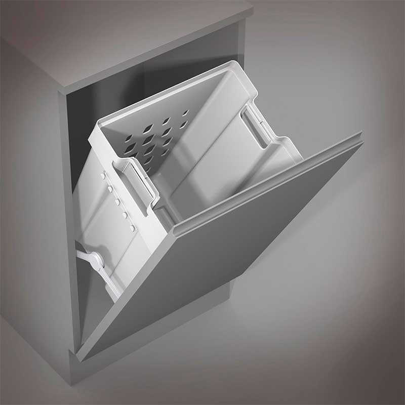 Cesto inclinable para organizar la ropa sucia. Este cesto de lavandería está dimensionado para un módulo de 450 mm.