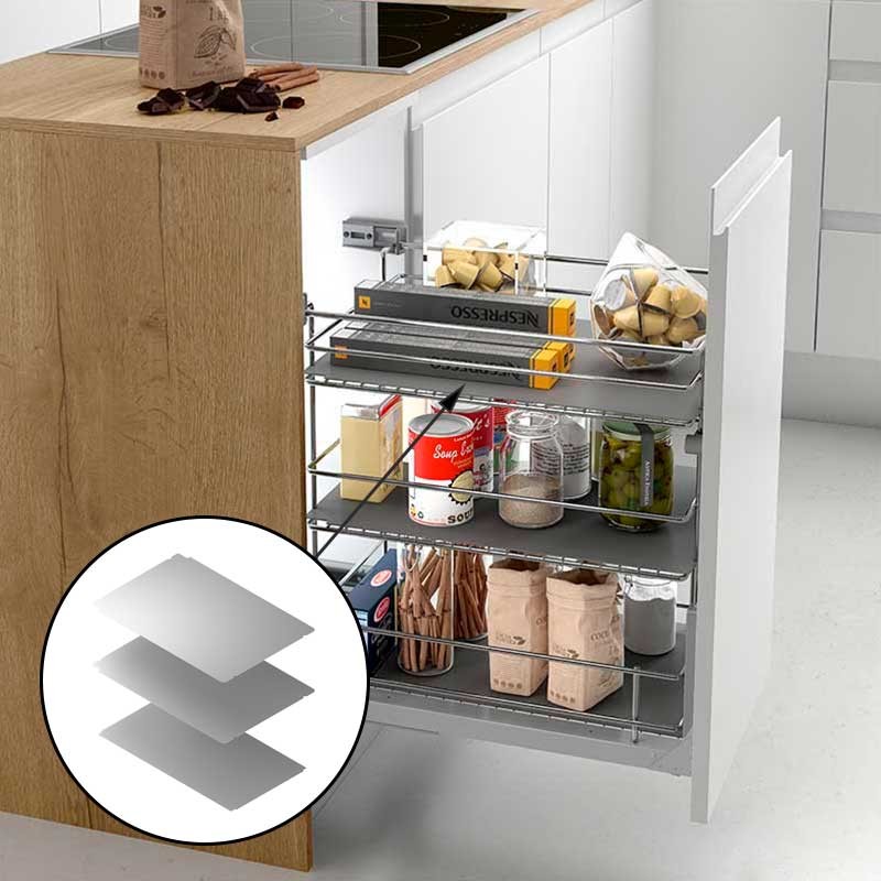 Herraje módulo extraible verdulero de 3 pisos. Acabado en acero cromado. Guías de extracción total con freno. Varias medidas disponibles.