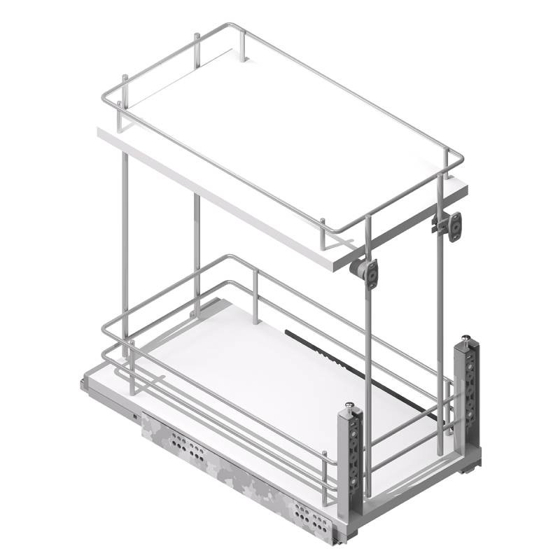 Módulo extraible para mueble de cocina para almacenaje de botellas, botes o productos similares. El diseño de la parte inferior incorpora divisiones para evitar que las botellas golpeen unas con otras.