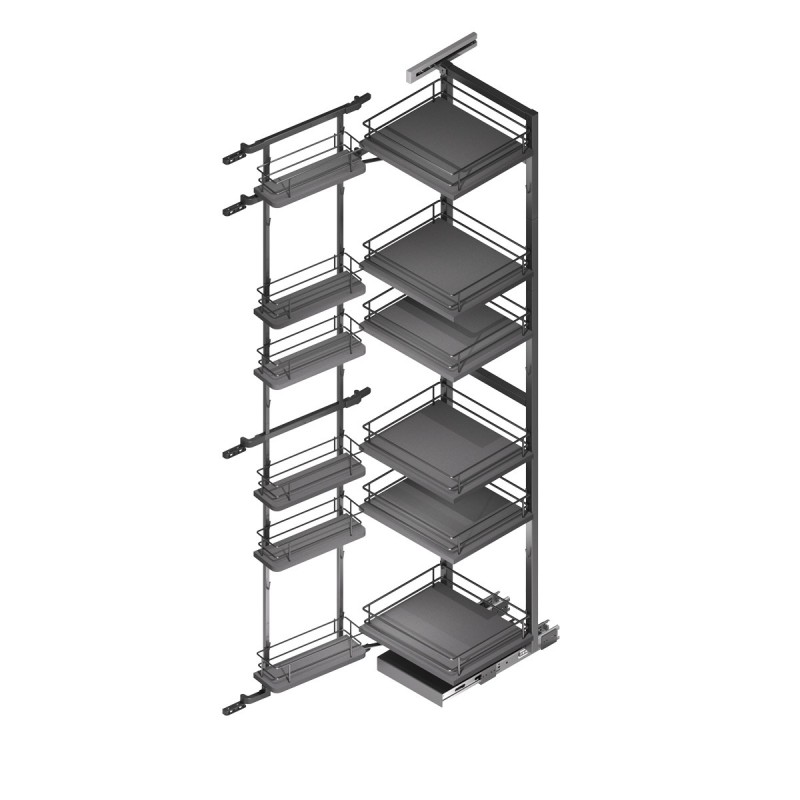 Extraible columna despensero Compact fabricado en acero acabado antracita con bases de melamina, guías de extracción total y cierre amortiguado.