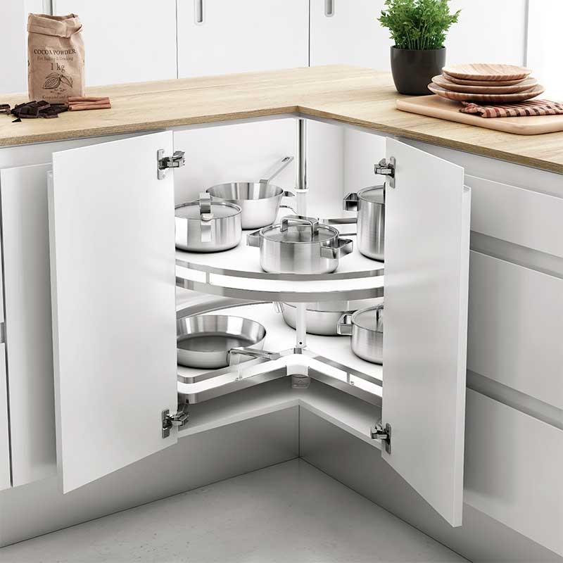 Módulo extraíble con bandejas giratorias de 270º para mueble rinconera de cocina. Doble altura de bandejas para mejor aprovechamiento del espacio. Cada bandeja gira independiente de la otra.