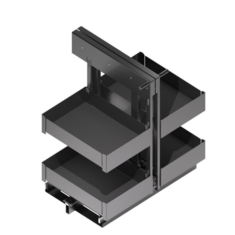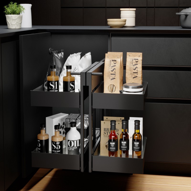 Módulo kit bastidor extraíble para mueble rinconera de cocina. Doble cuerpo y doble altura de bandejas para una mayor capacidad y aprovechamiento del espacio.