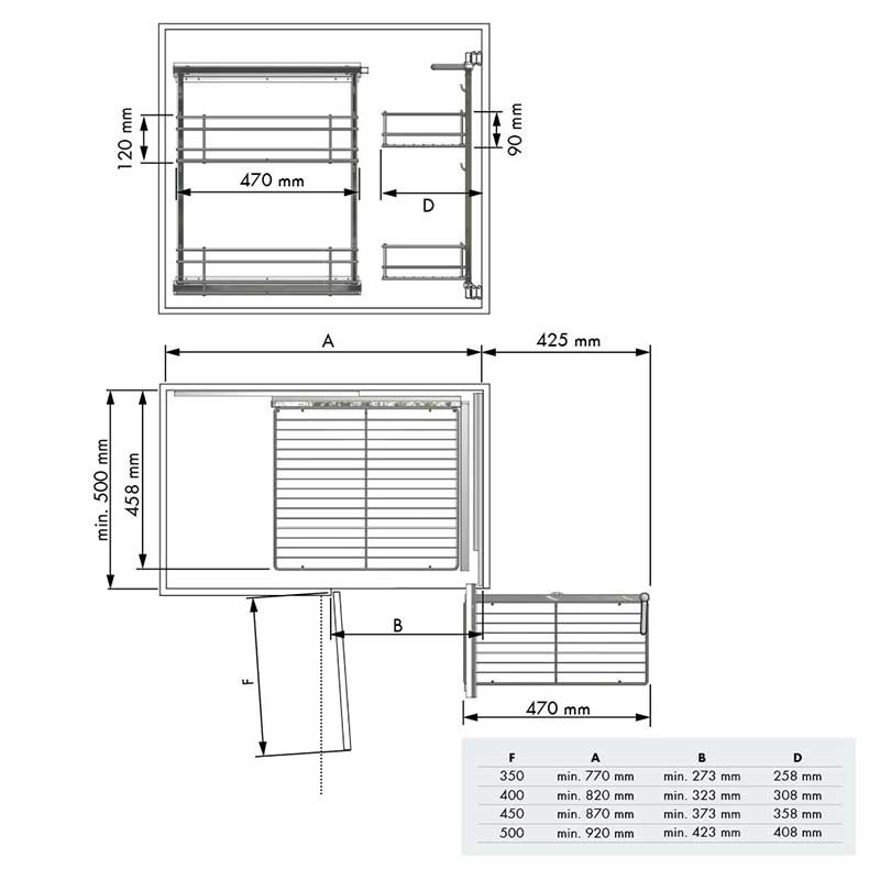 Módulo kit extraible articulado de acero para mueble rinconera de cocina. Doble cuerpo y doble altura de bandejas para una mayor capacidad y aprovechamiento del espacio.