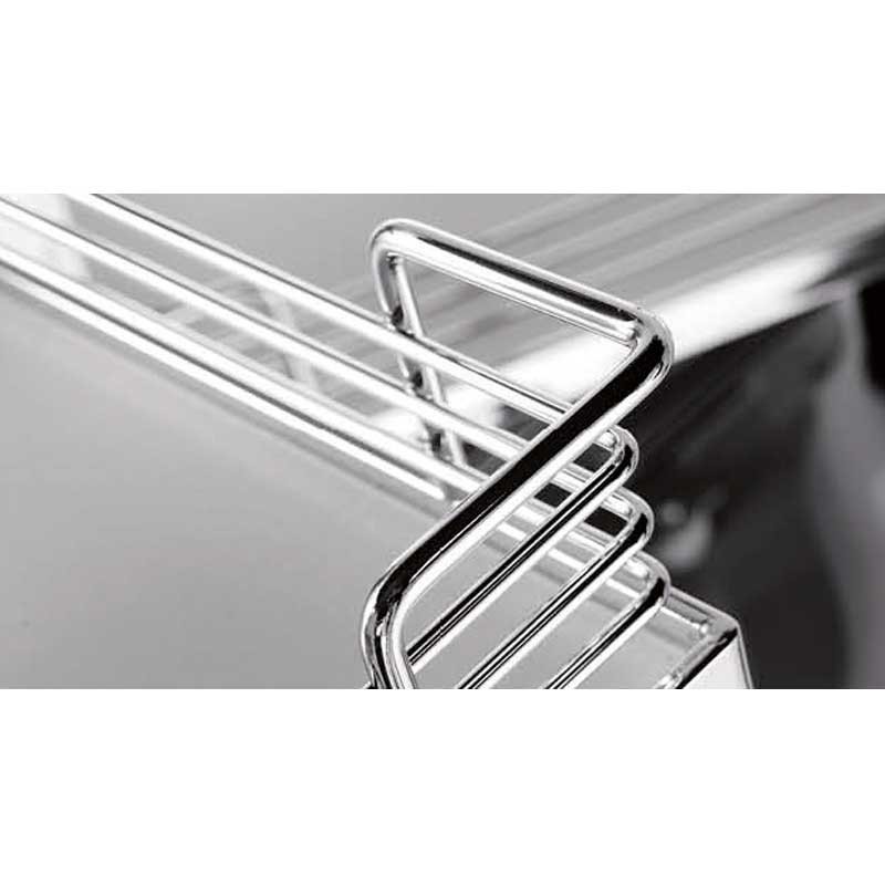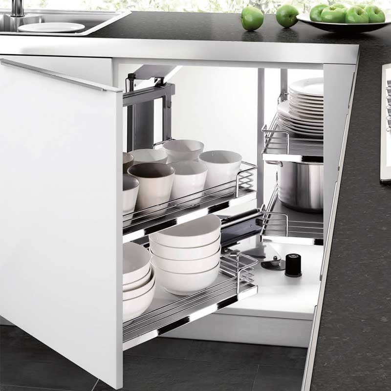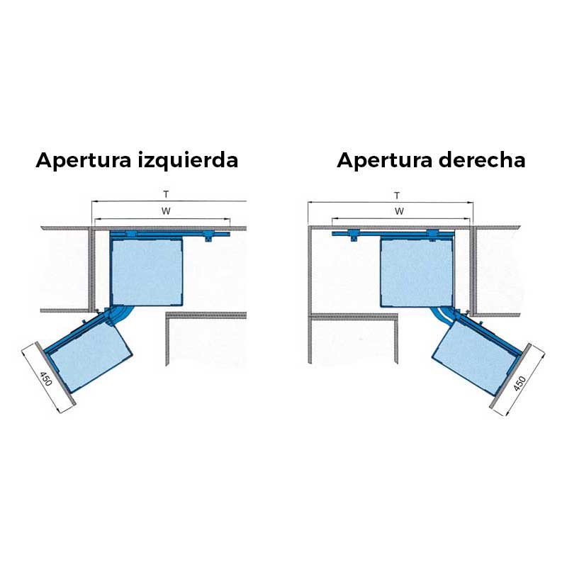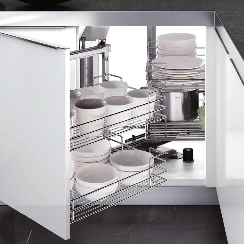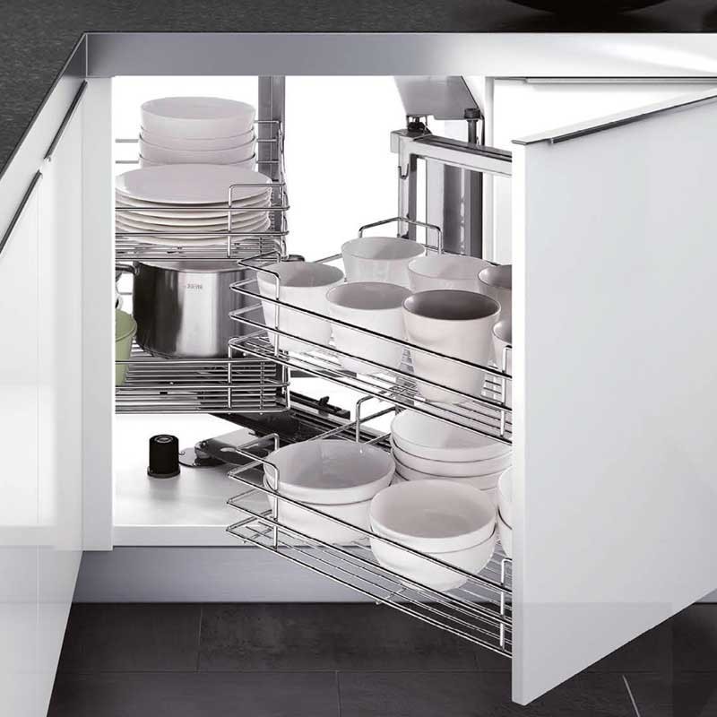 Módulo extraíble frontal de 4 bandejas Magic Corner para mueble rincón ciego de cocina de 900 mm de ancho mínimo y puerta de 450 mm. Bandejas con base de madera gris. Apertura puerta a elegir.