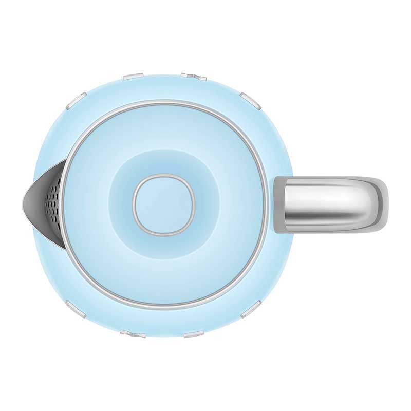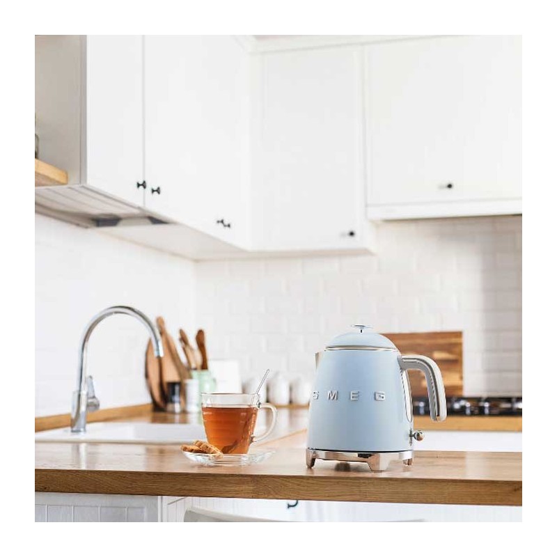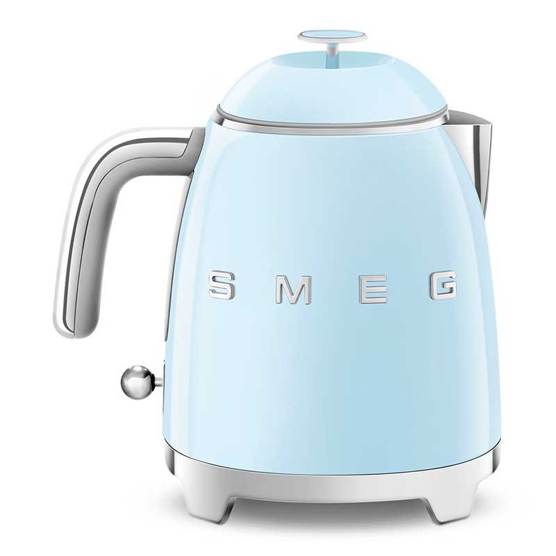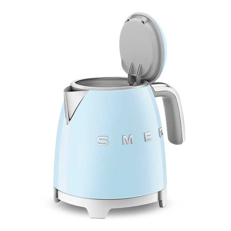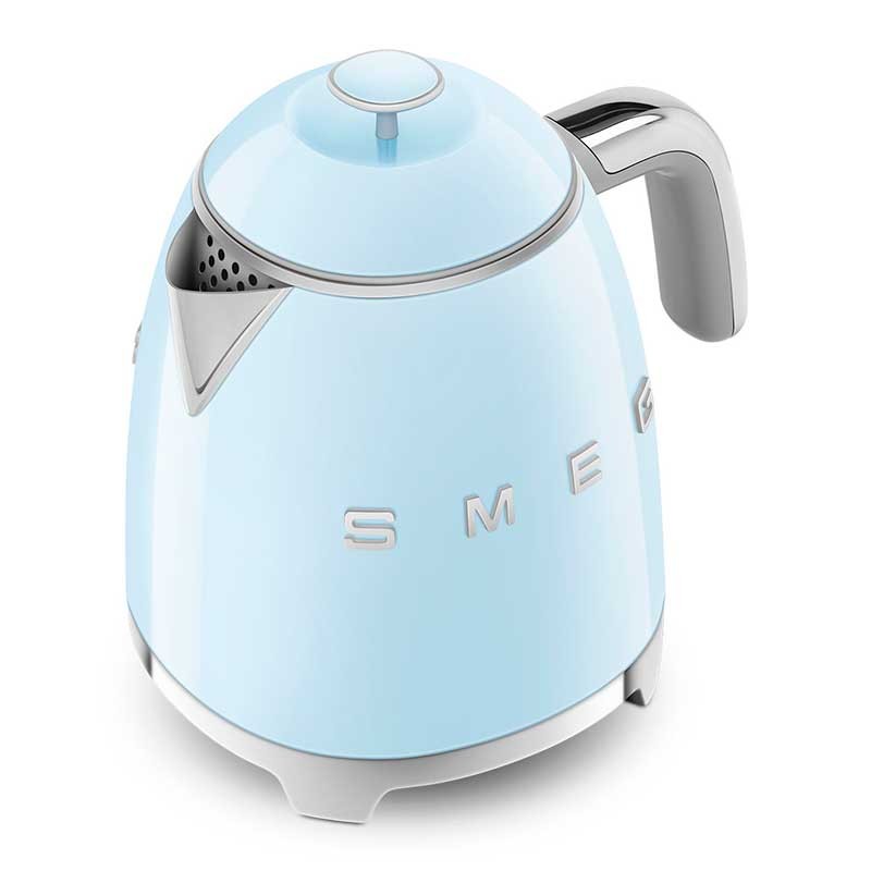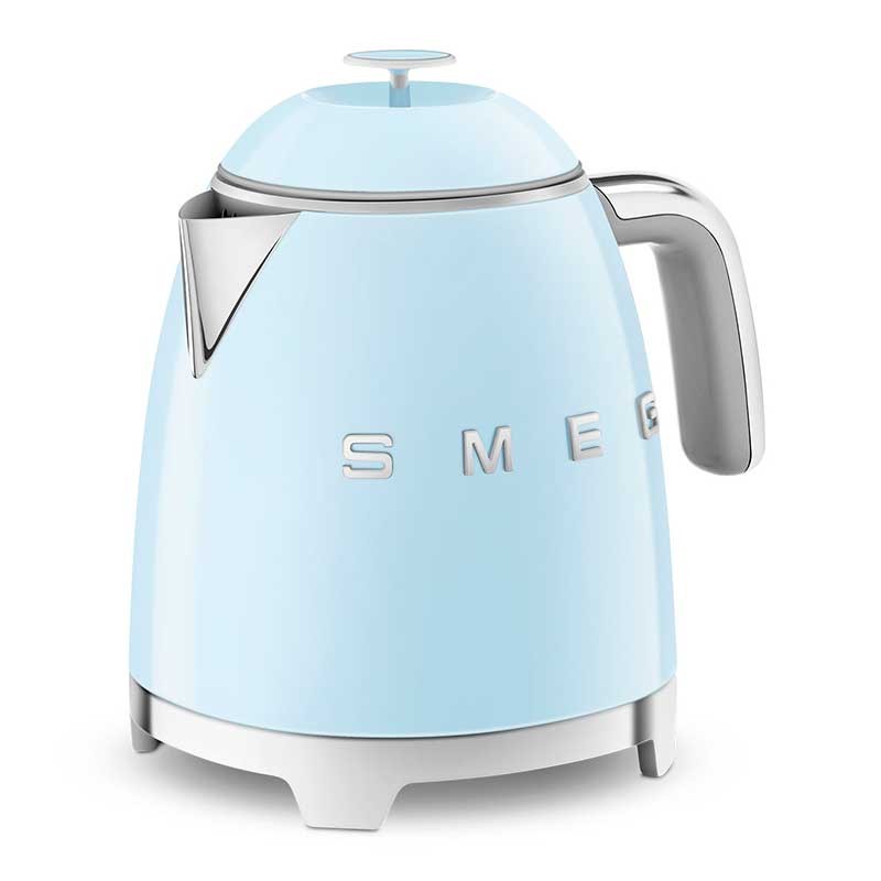 Hervidor mini Smeg 50's Style de 0,8 litros de capacidad con cuerpo en plástico acabado azul cielo brillo y base giratoria 360º.