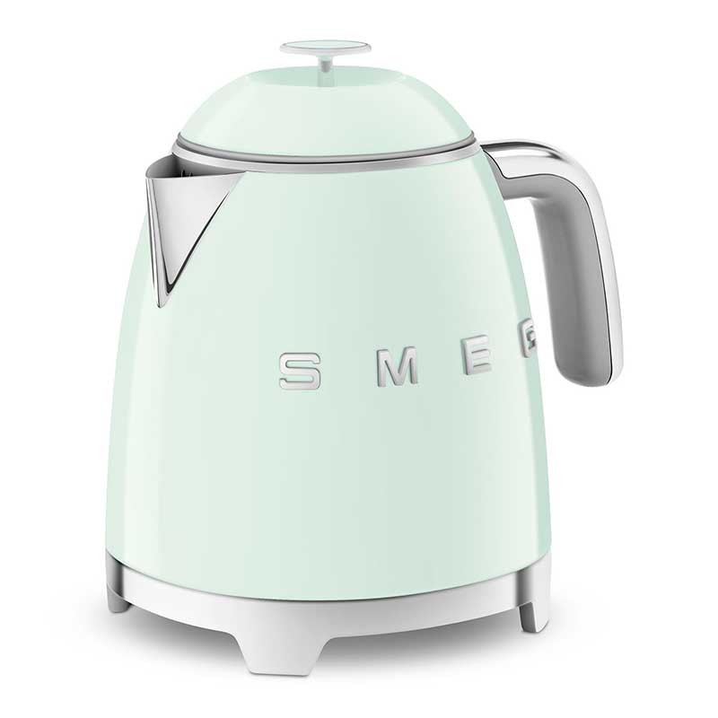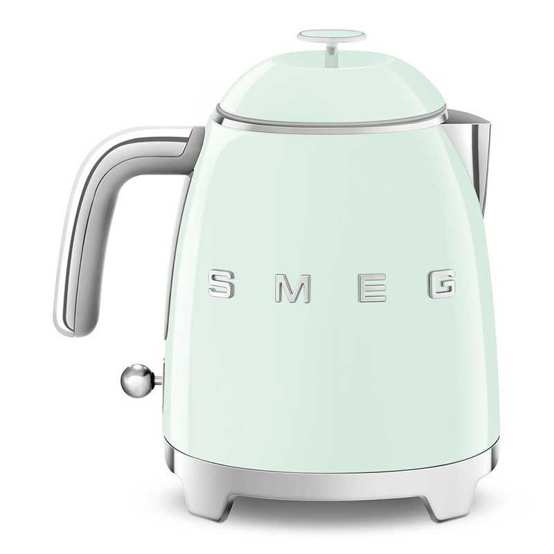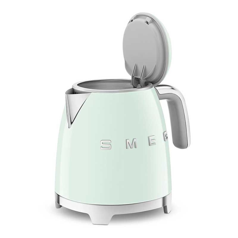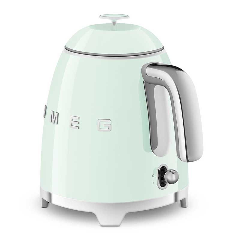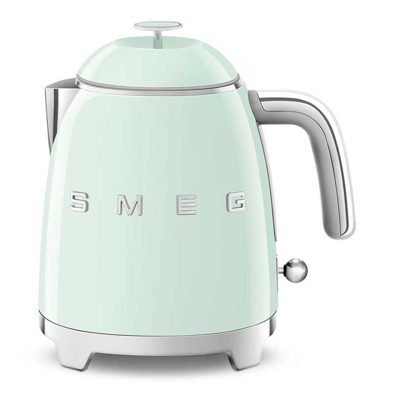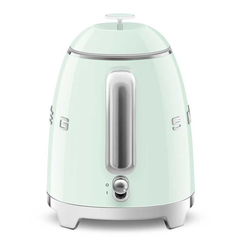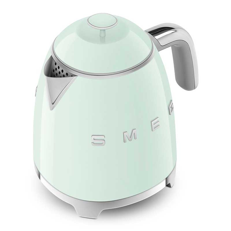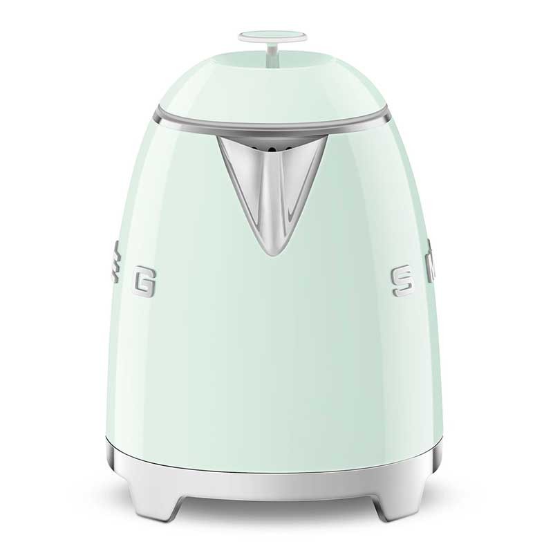 Hervidor mini Smeg 50's Style de 0,8 litros de capacidad con cuerpo en plástico acabado verde agua brillo y base giratoria 360º.
