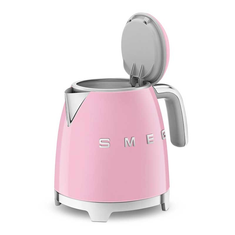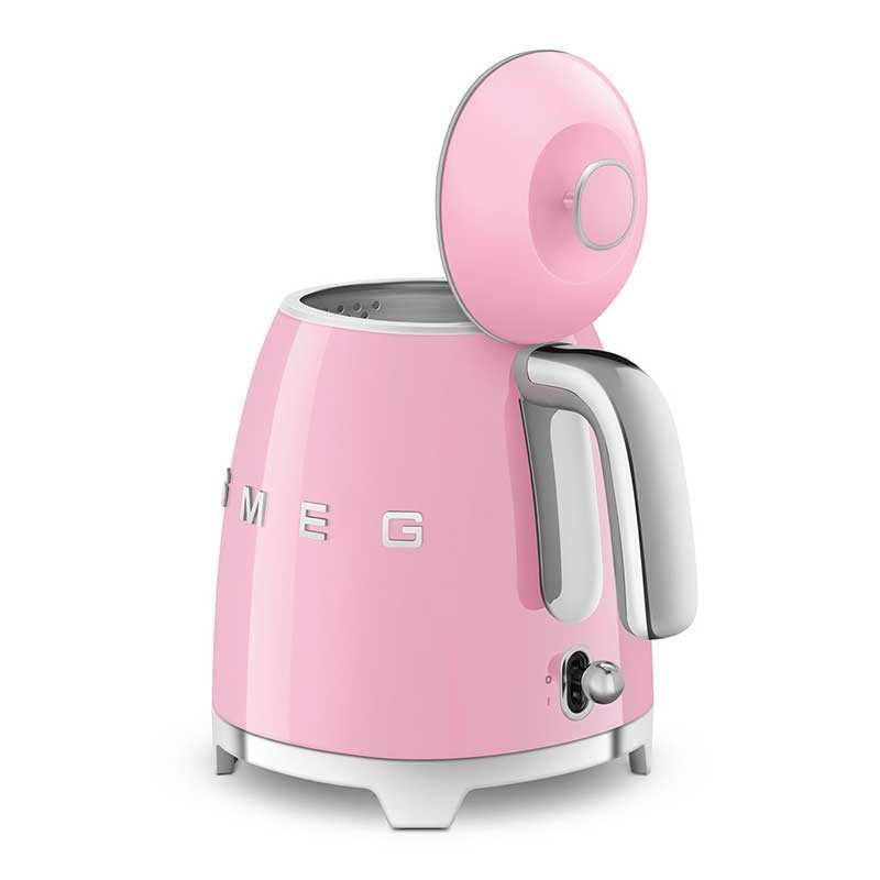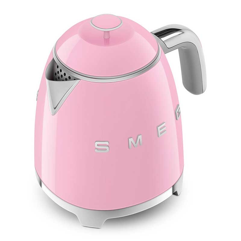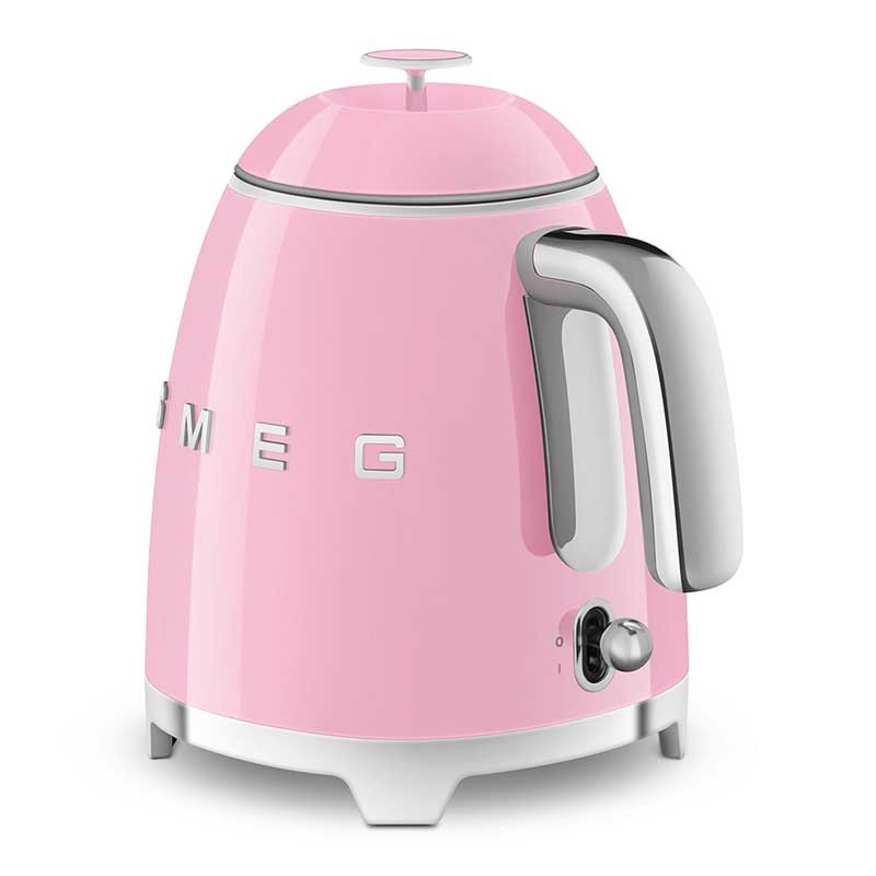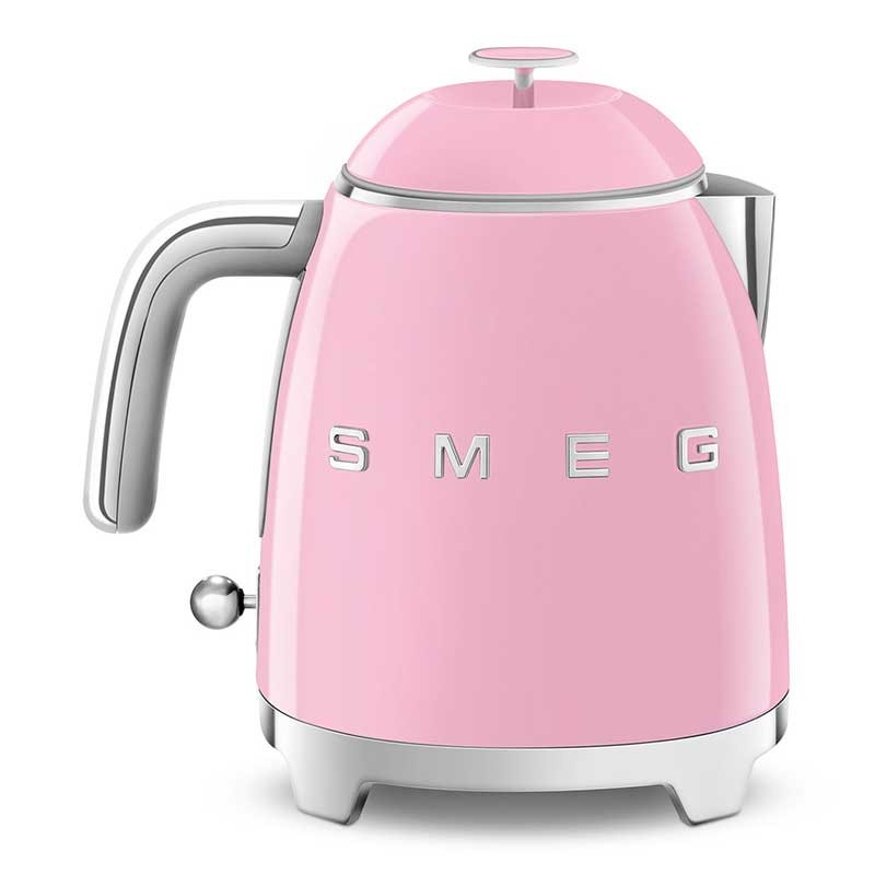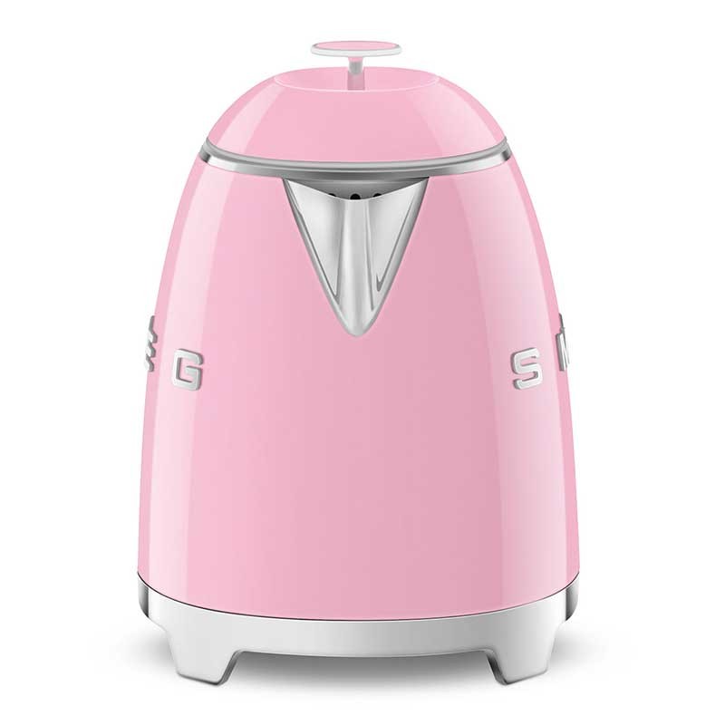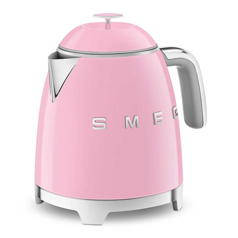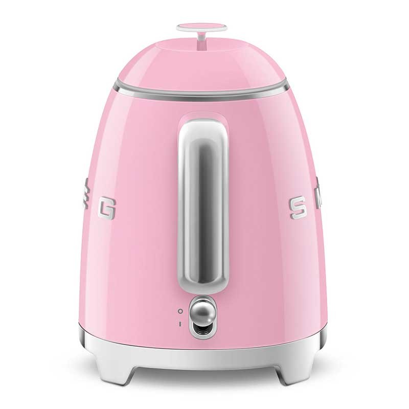 Hervidor mini Smeg 50's Style de 0,8 litros de capacidad con cuerpo en plástico acabado rosa brillo y base giratoria 360º.