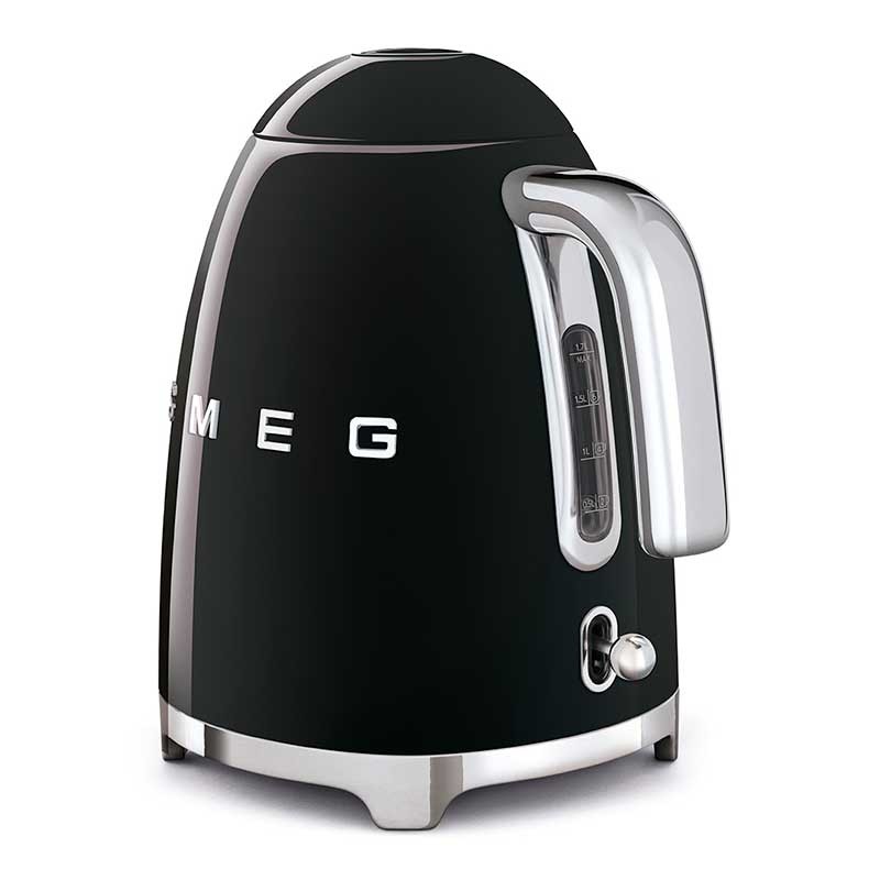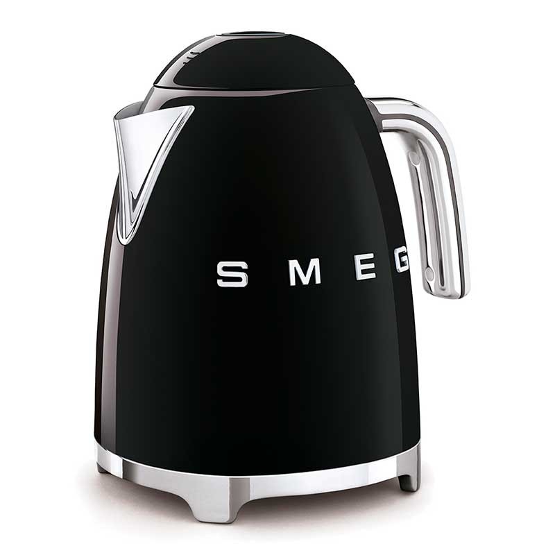 Hervidor estándar Smeg 50's Style de 1,7 litros de capacidad con cuerpo en acero inoxidable acabado negro brillo y base giratoria 360º.