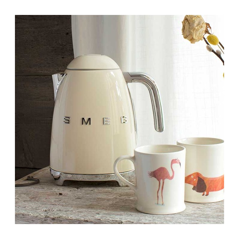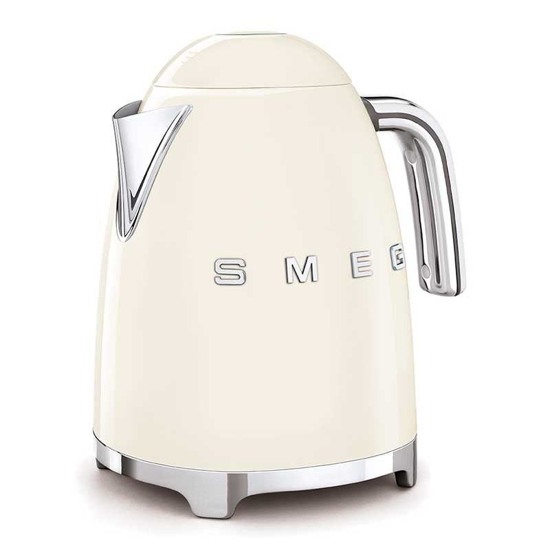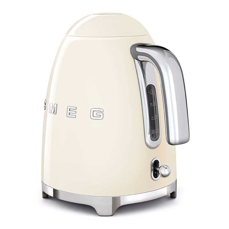 Hervidor estándar Smeg 50's Style de 1,7 litros de capacidad con cuerpo en acero inoxidable acabado crema brillo y base giratoria 360º.