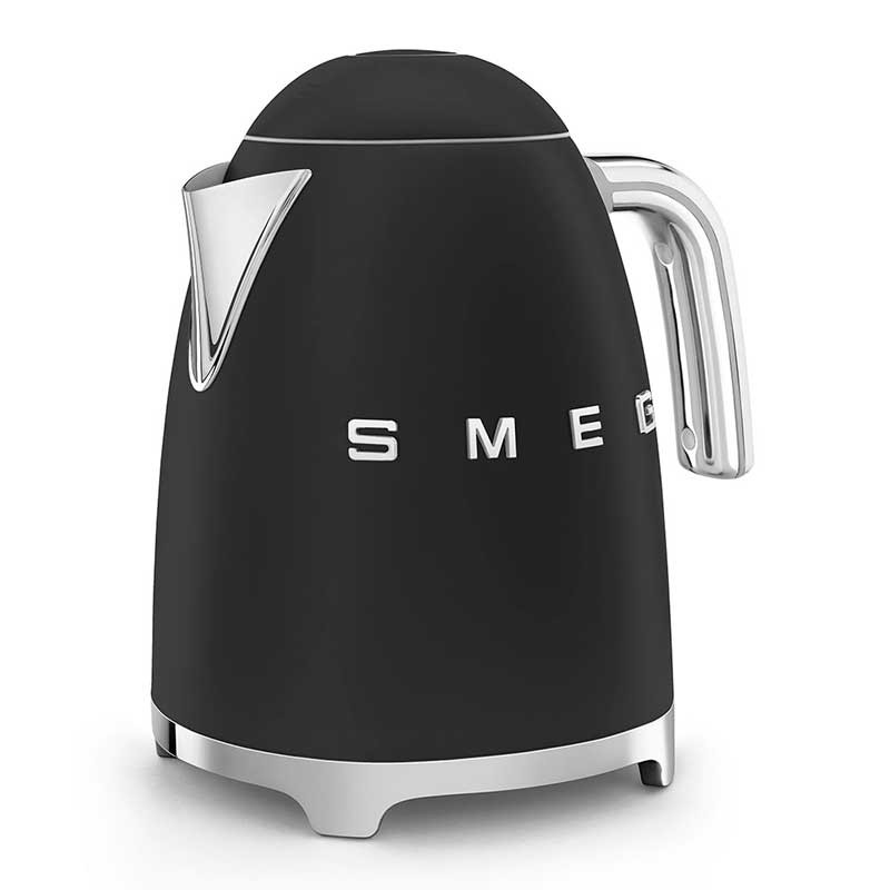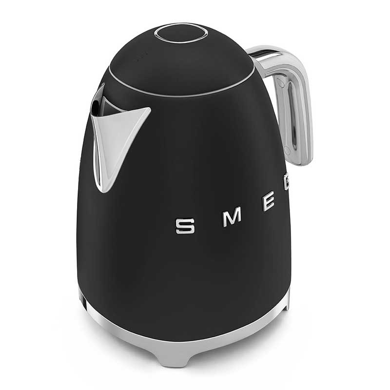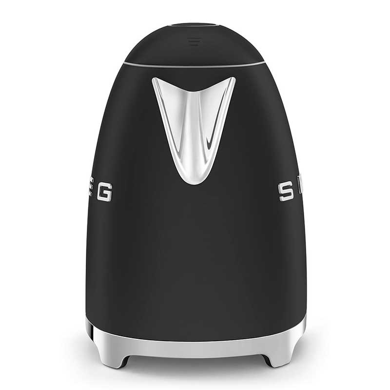 Hervidor estándar Smeg 50's Style de 1,7 litros de capacidad con cuerpo en acero inoxidable acabado negro mate y base giratoria 360º.