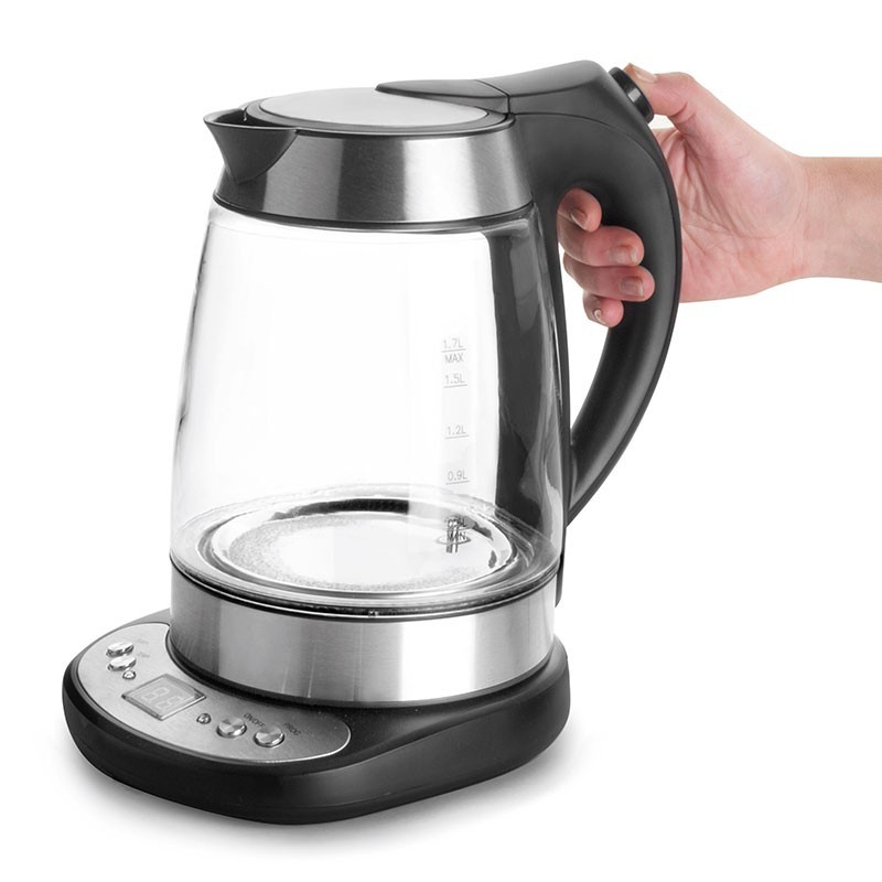 Hervidor de agua eléctrico de 2200 W con temperatura ajustable y sistema de autoapagado, fabricado en acero inoxidable 18/10 y cristal.