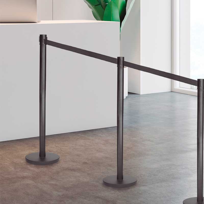 Poste metálico negro de 90 cm de altura con cinta de 2 metros de longitud y mecanismo retráctil para acotar o delimitar zonas de acceso en lugares públicos.