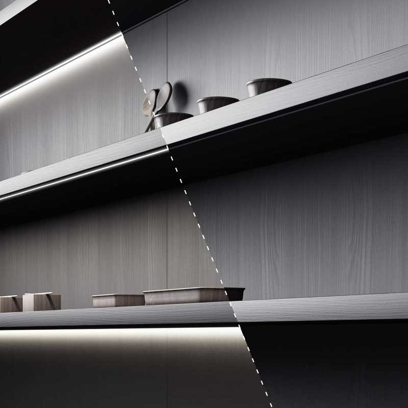 La regleta requiere herramientas específicas para hacer el mecanizado para que quede completamente integrada en el mueble, de una forma discreta y elegante.