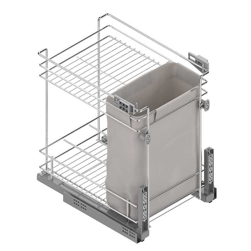 Accesorio extraíble con espacio para almacenaje de botellas, especias y saca de pan. Acabado en acero cromo. Extracción parcial de módulo. La saca se quita para lavarse.