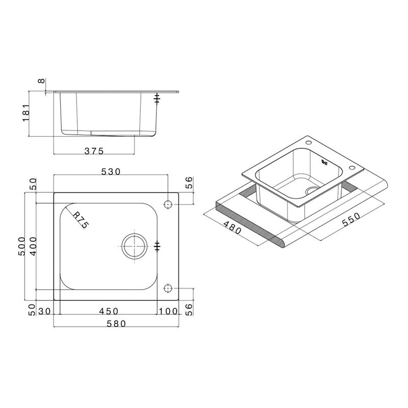 Fregadero de acero inoxidable satinado modelo Roma de 580 x 500 mm para instalación sobre encimera.