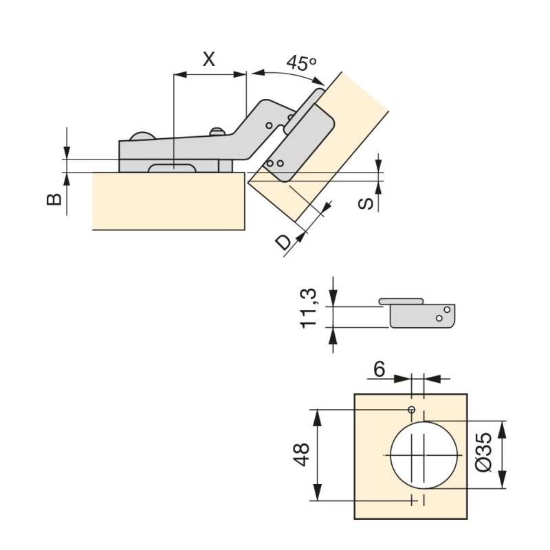 Bisagras con brazos angulares para puertas especiales en muebles tipo esquineros o rinconeros. Destacan por su pistón amortiguador que proporciona un cierre suave de la puerta. Están disponibles en versión con brazo angular de 45º con una apertura de la puerta de 95º. Para su instalación precisan de un taladro previo de diámetro 35 mm para la cazoleta. Y su fijación al tablero se realiza mediante tornillos incluidos. Asimismo se distinguen por su fácil instalación gracias al sistema automático de montaje en clip de la bisagra al suplemento. Además ambos disponen de tornillo excéntrico para una regulación rápida y cómoda. La fijación del suplemento se realiza con tornillo Euro que precisa de un taladro previo de diámetro 5 x 12 mm utilizado en tableros con cremallera de taladros.
