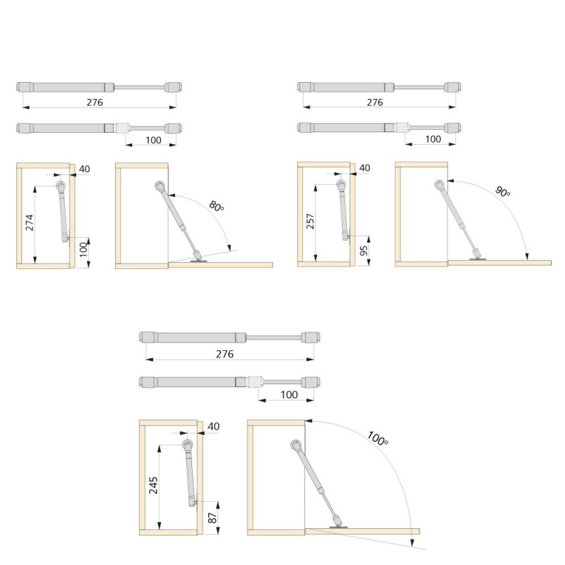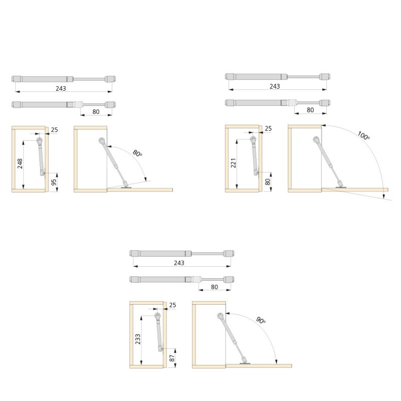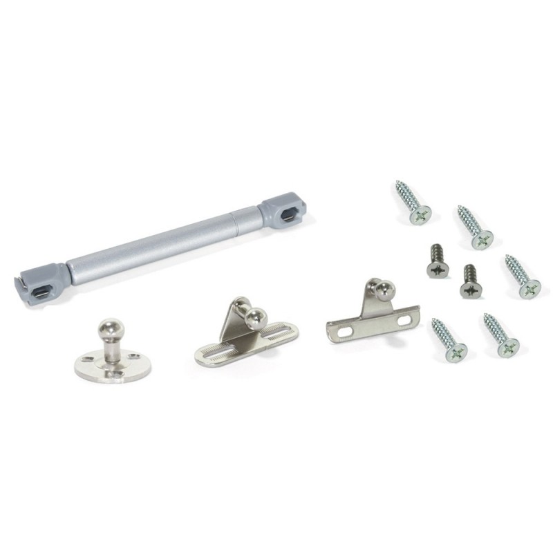 Pistones para muebles que permiten la apertura de las puertas de madera o con marco de aluminio. Proporcionan una bajada amortiguada de la puerta abatible en muebles de cocina, hogar y baño. Dichos pistones amortiguadores se suministran embolsados individualmente con las instrucciones de montaje. Cada bolsa contiene un pistón, un enganche para costado, un enganche para puerta de madera, un enganche para puerta con margo de aluminio y los tornillos necesarios.