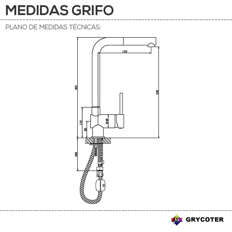 Grifo monomando vertical Grycoter GF119 para fregadero de cocina con ducha extraible. Alto: 36,2 cm hasta la base. Fondo: 19,5 cm.