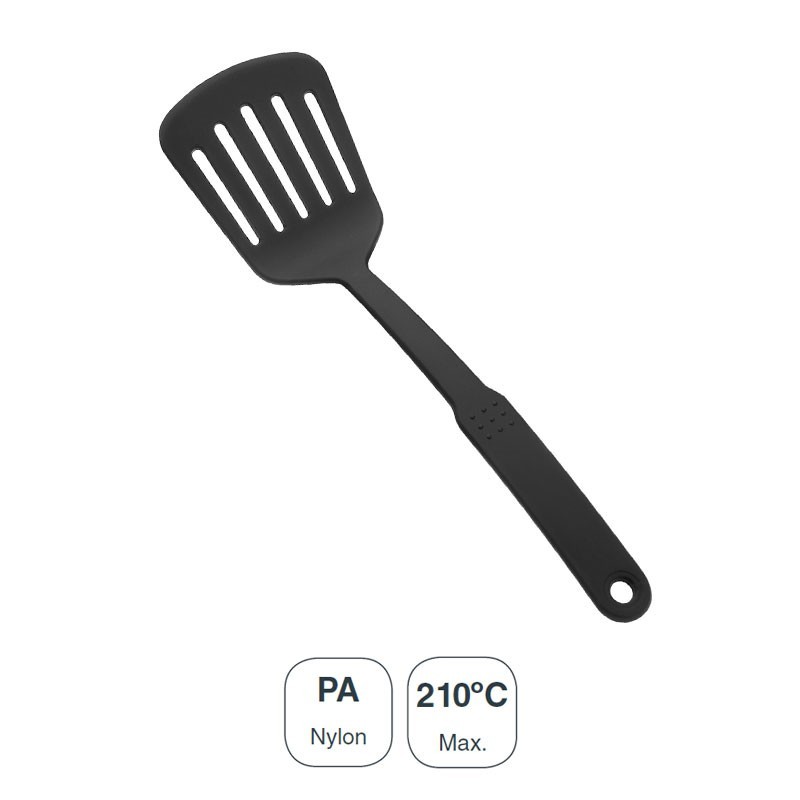Espátula perforada para cocina de la Serie Black fabricada en nylon para temperaturas de cocinado de hasta 210ºC. Medidas: 32x9x4 cm.
