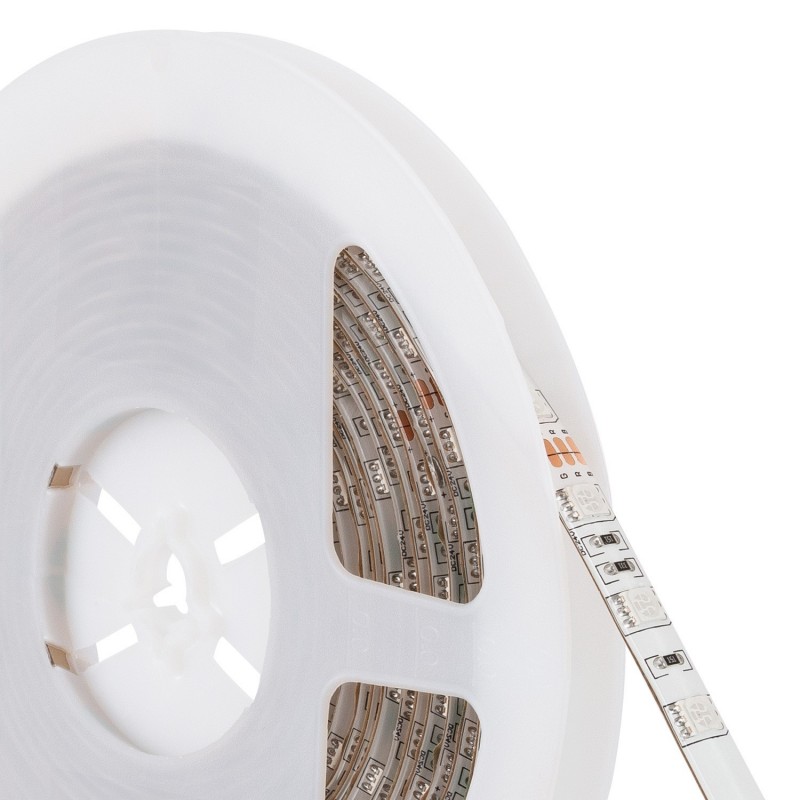 Esta tira LED RGB de 12V DC tiene una longitud de 5 metros y utiliza LEDs SMD5050 de alta luminosidad, proporcionando 1200 lm/m con un ángulo de emisión de 120º.