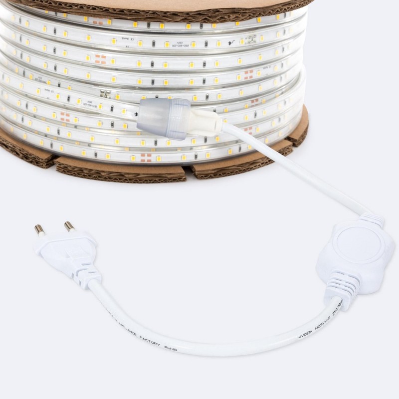 La bobina de tira LED regulable 220V SMD2835 500 lm/m, de 12 mm de ancho y 50 m de longitud, con clasificación IP65, se conecta directamente a la red eléctrica, sin necesidad de una fuente de alimentación adicional. Su flexibilidad le permite adaptarse a casi cualquier superficie.