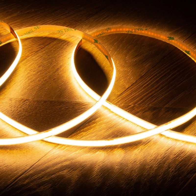 Esta tira LED, con una longitud de 5 metros, utiliza LEDs de tecnología COB de alta eficiencia, lo que asegura una distribución uniforme de la luz y un mayor rendimiento lumínico por vatio comparado con los LEDs SMD tradicionales. Con un ancho de solo 8 mm, puede instalarse en casi cualquier rincón del hogar. Además, su alto índice de reproducción cromática (CRI) de 90 garantiza una representación de colores muy natural, lo que la hace ideal para tiendas de ropa, estudios de fotografía y diseñadores, donde se requiere una iluminación precisa. Es importante notar que para funcionar, esta tira necesita una fuente de alimentación.