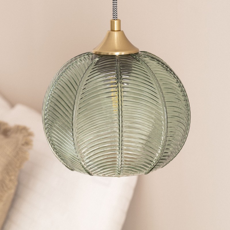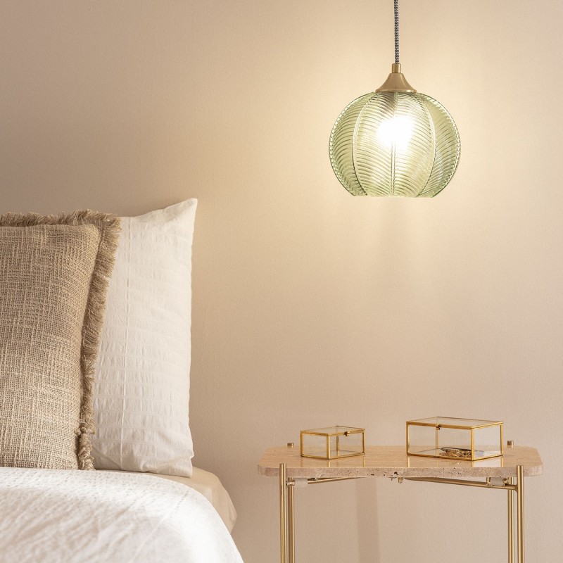La lámpara colgante cristal Klimt está fabricada con metal y cristal. Su pantalla esférica, con sutiles relieves y un toque azulado, evoca las lámparas clásicas de los años 20, destacándose como su principal característica de diseño.