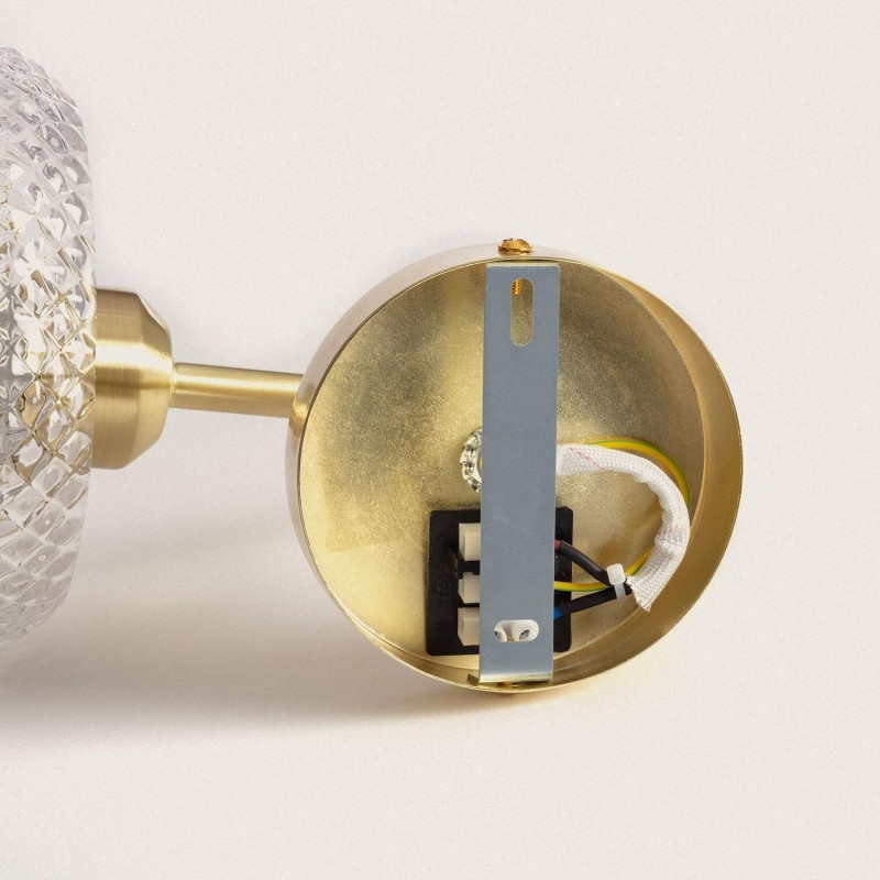 La lámpara de pared Stiklu presenta una tulipa de cristal con relieves geométricos y un florón y portalámparas metálicos en dorado satinado. Los acabados y materiales utilizados en su fabricación son de la más alta calidad. Es ideal para colocarla en una variedad de espacios, como salones, dormitorios, pasillos de hoteles, tiendas, bares y restaurantes.