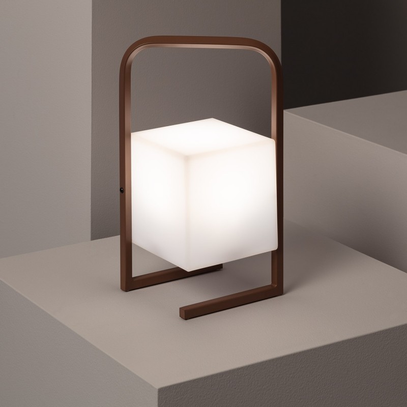 La lámpara de mesa LED 2.5W portátil para exterior con batería USB recargable Tiber es una lámpara ligera y de diseño elegante. Cuenta con una base de acero con asa y un difusor cúbico de polietileno que emite una agradable luz neutra.