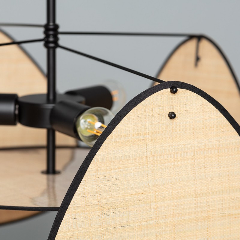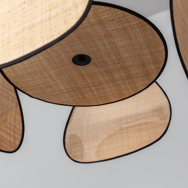 Esta lámpara presenta un cuerpo de metal negro y cuatro pantallas ovaladas, que juntas forman una estructura cuadrada. Las pantallas están fabricadas en rafia, una fibra natural flexible y resistente, que aporta un toque cálido al espacio.
