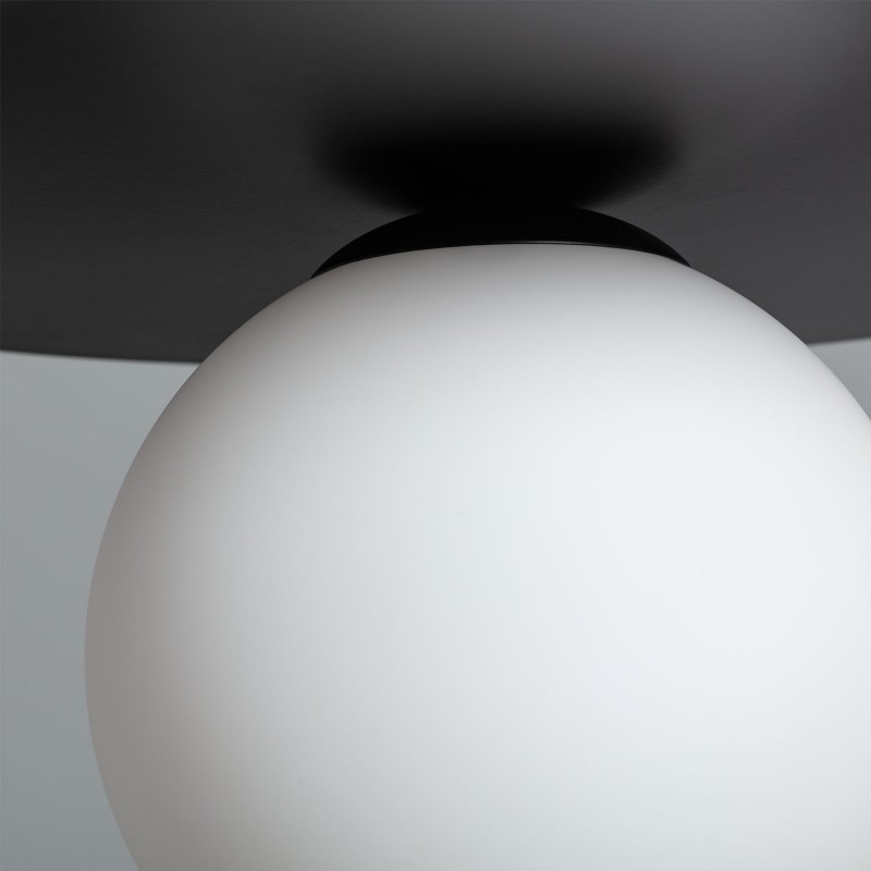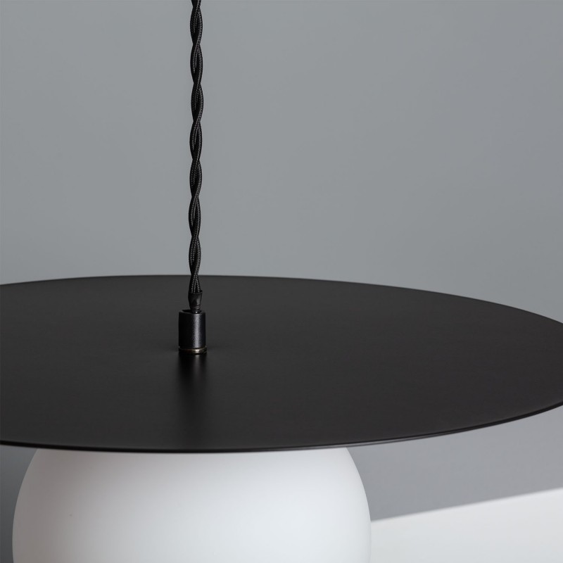Esta lámpara presenta un cuerpo portalámparas de metal en acabado negro y una pantalla de cristal con efecto opal. Es ideal para una variedad de espacios interiores, incluyendo salones, comedores, dormitorios, restaurantes y locales comerciales.