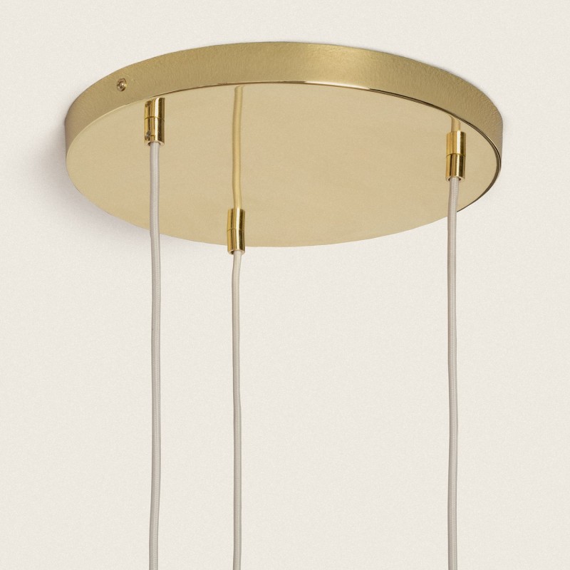 Esta lámpara destaca por su diseño vintage, evocando los antiguos recipientes de cristal soplado de talleres artesanales. Fabricada con materiales y acabados de alta calidad, cuenta con tres tulipas que cuelgan de un gran florón metálico con acabado dorado, aportando un toque elegante al entorno.