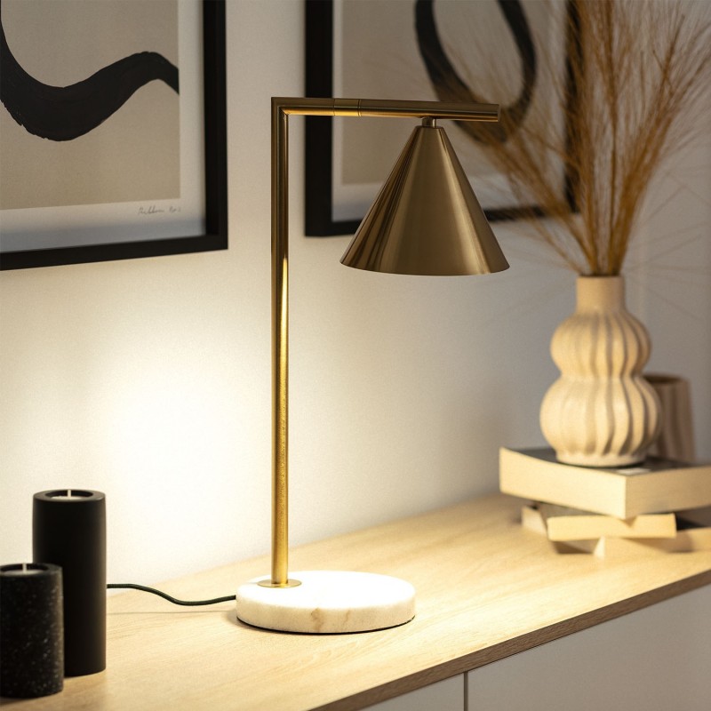 La lámpara de mesa Tinos presenta una estructura dorada fabricada en metal y una base de mármol que añade un toque moderno. La calidad de la luz emitida depende de la bombilla E27 que se instale, permitiendo elegir entre diferentes tipos de iluminación como cálida, fría, neutra o incluso RGB. Se recomienda utilizar bombillas de filamento para crear un ambiente más acogedor. La lámpara incluye un cable con enchufe europeo schuko y un pequeño interruptor para mayor comodidad.