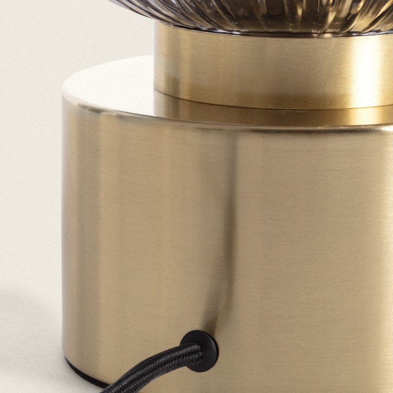 La lámpara de mesa Windsor presenta un cuerpo cilíndrico en color dorado con un acabado satinado y una tulipa de cristal con un diseño y color distintivos.