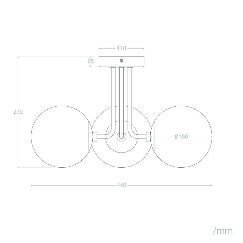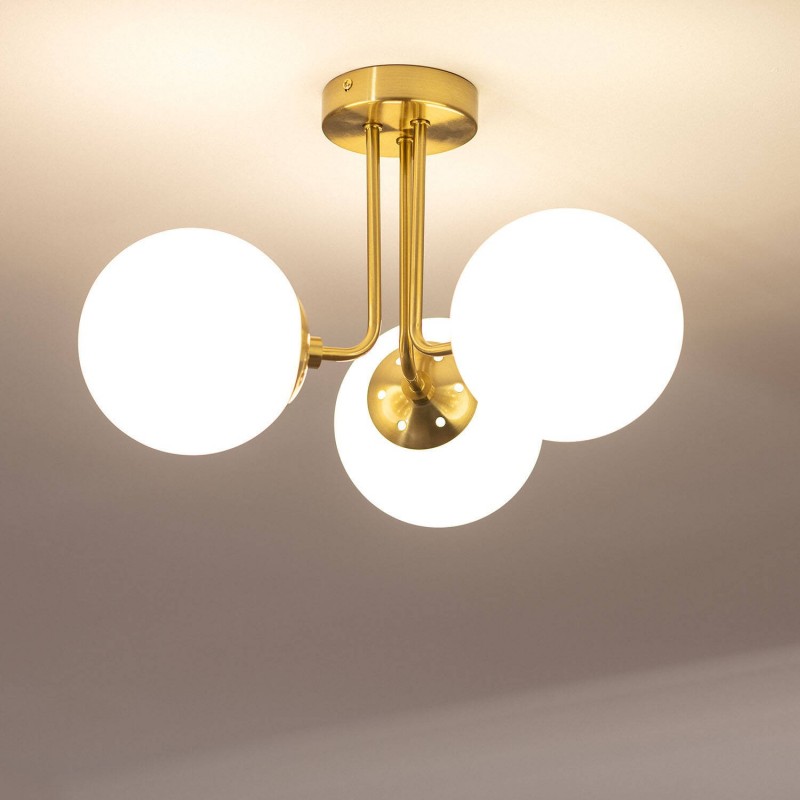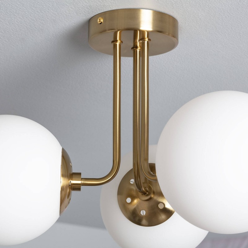 Esta lámpara presenta un cuerpo principal rígido, unido al florón, fabricado en metal con un elegante acabado dorado. Las tres pantallas esféricas de cristal blanco mate, con lente opal, garantizan una dispersión uniforme de la luz.