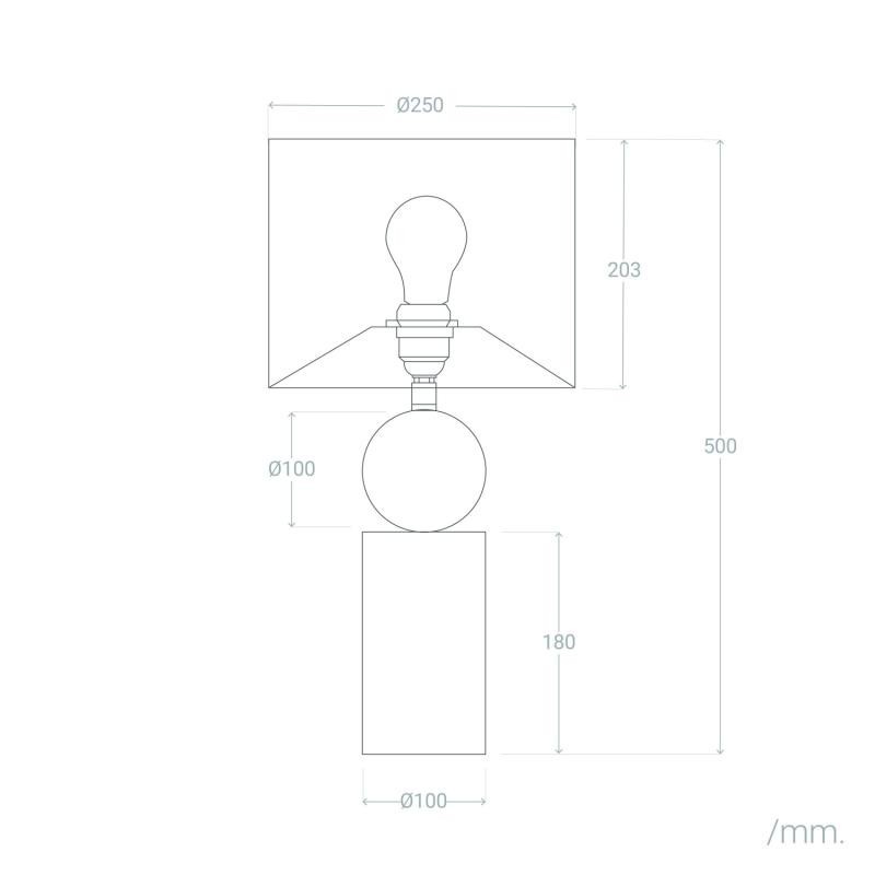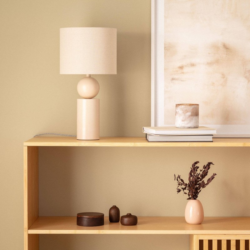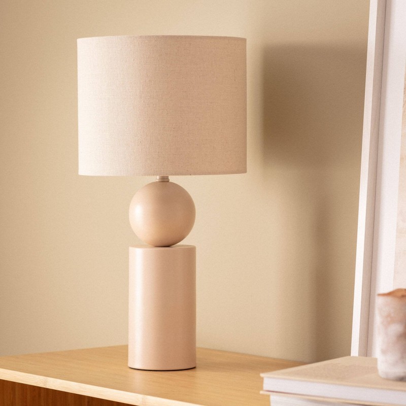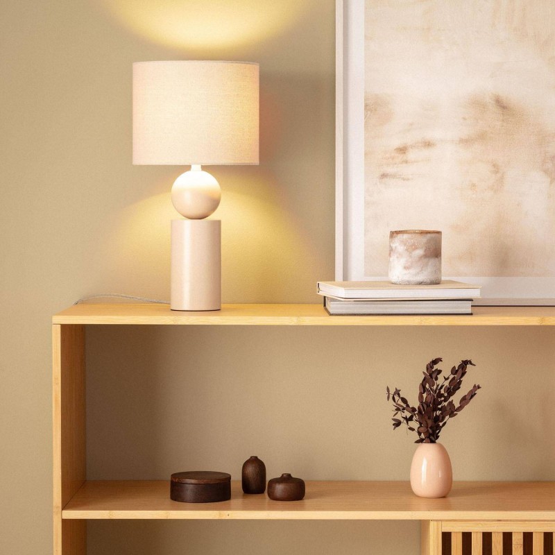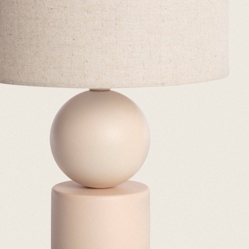 Esta lámpara se distingue por su diseño simple pero elegante. La base de cerámica presenta acabados que evocan dos figuras geométricas unidas, combinando sencillez y elegancia en su tono beige. La pantalla de tela disipa la luz de manera uniforme, creando un ambiente acogedor y relajante en cualquier espacio familiar.