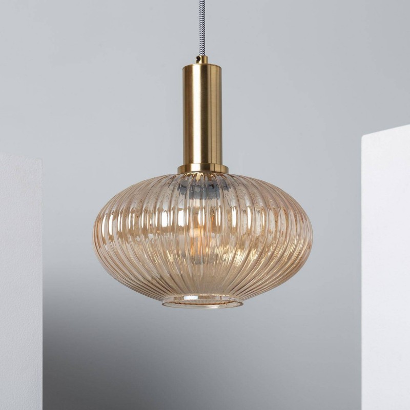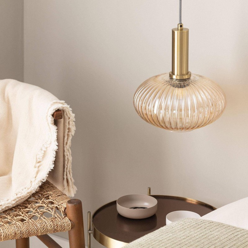 Fabricada en metal y cristal, la lámpara colgante cristal Basile destaca por su pantalla esférica con sutiles relieves que evocan el estilo de las lámparas clásicas de los años 20.