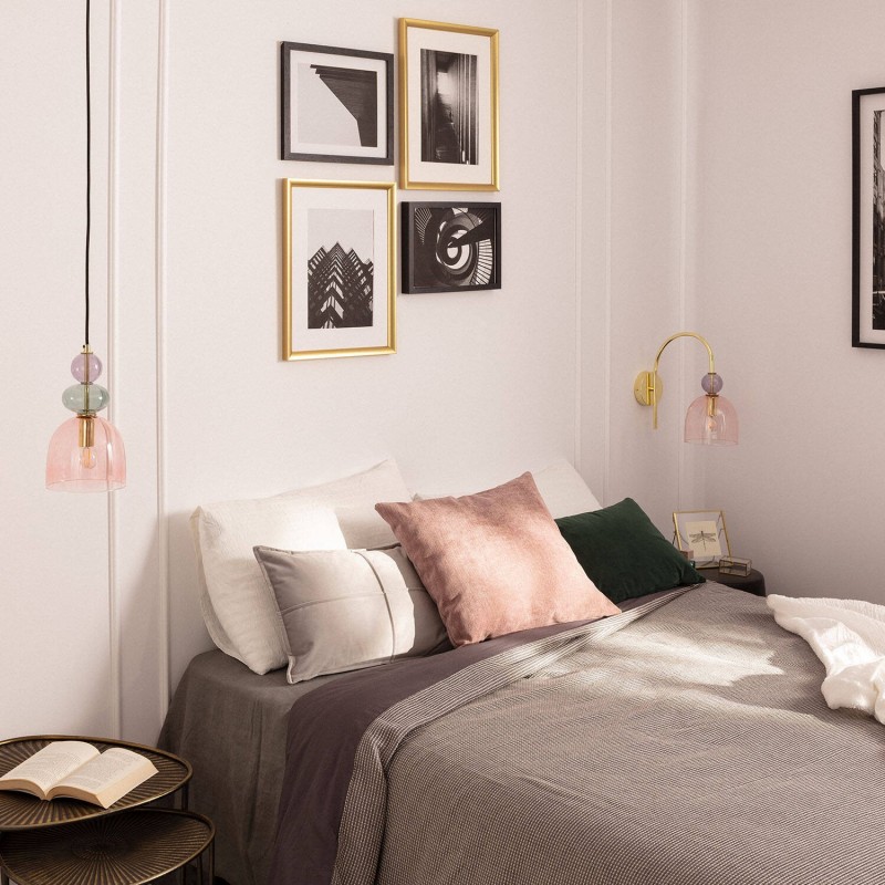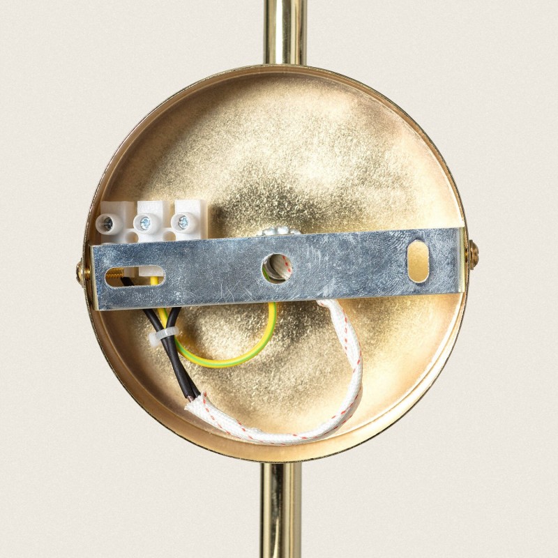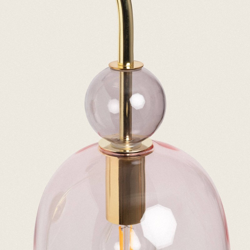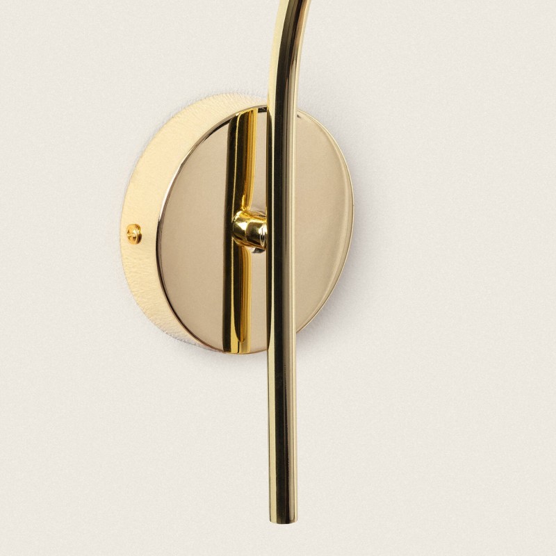 Esta lámpara de pared es ideal para espacios con estilo vintage, destacando por su fabricación principal en cristal de color y metal dorado.