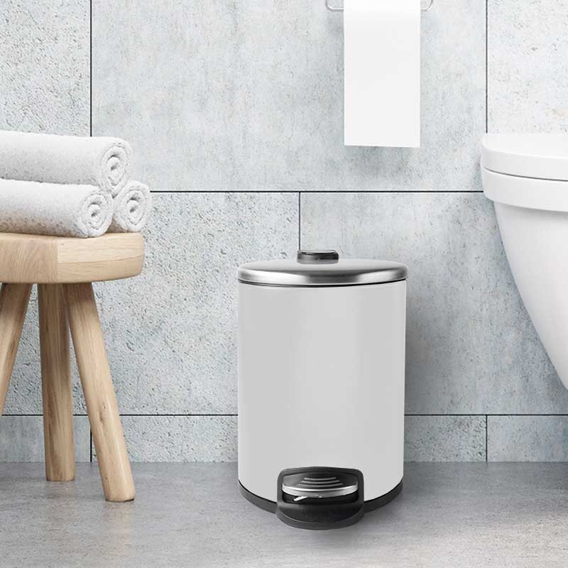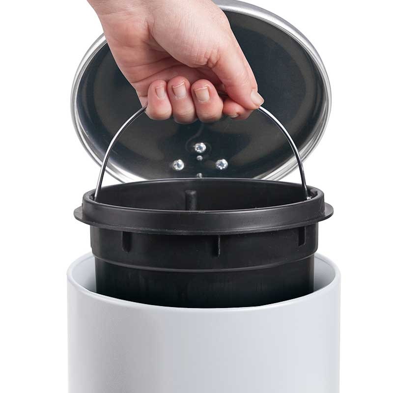 Papelera de 3 litros en acero inoxidable color blanco con apertura de tapa mediante pedal y cubeta interior extraíble de polipropileno con asa.