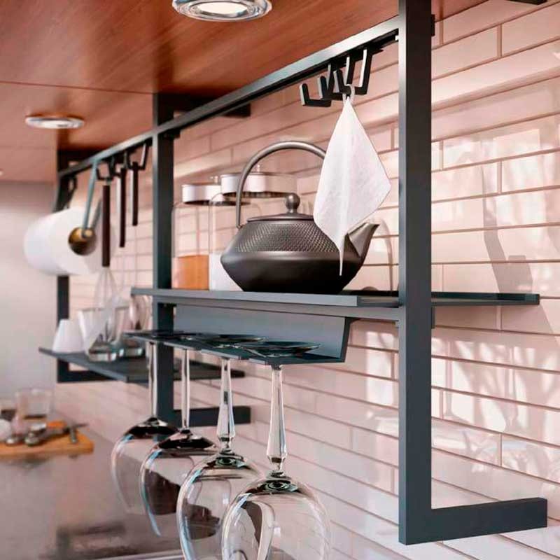 Linero Up está unido a la parte inferior de los armarios altos lo que le permite optimizar el espacio sin tornillos en la parte posterior de la cocina. El marco modular está hecho de 2 barras horizontales movibles que pueden ser personalizadas con una amplia gama de accesorios de cocina. Funcional y con estilo agrega orden y minimalismo a tu cocina.