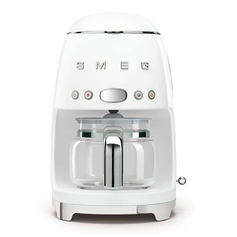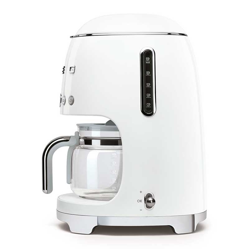 Cafetera de goteo-filtro Smeg 50's Style con selección de intensidad del café regulable y cuerpo de acero inoxidable y ABS acabado blanco brillo.