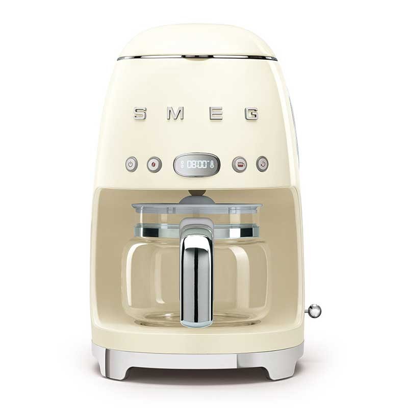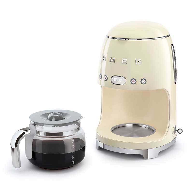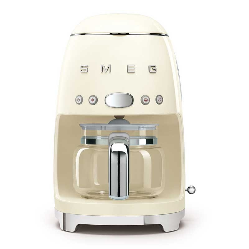 Cafetera de goteo-filtro Smeg 50's Style con selección de intensidad del café regulable y cuerpo de acero inoxidable y ABS acabado crema brillo.