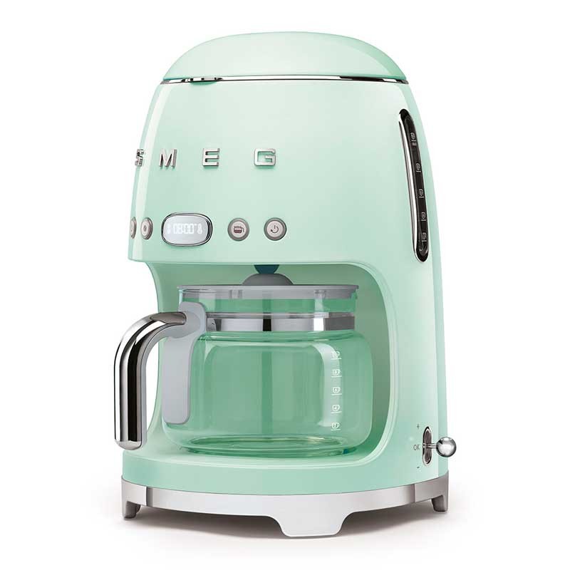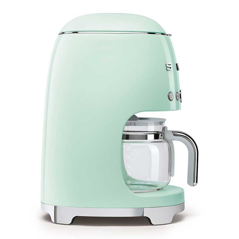 Cafetera de goteo-filtro Smeg 50's Style con selección de intensidad del café regulable y cuerpo de acero inoxidable y ABS acabado verde agua brillo.