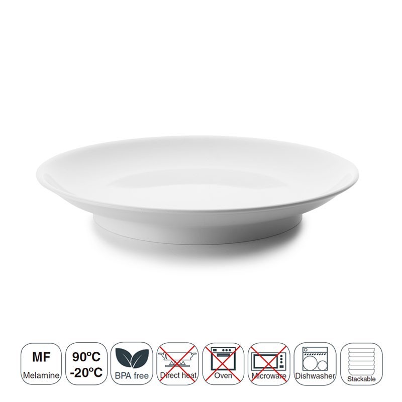 Fuente redonda Classic White fabricada en resina sintética de gran resistencia y apta para lavavajillas. Disponible en dos medidas.