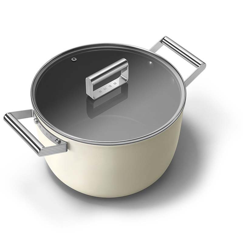 Cacerola alta antiadherente con tapa Smeg 50's Style de 26 cm de diámetro, cuerpo de aluminio forjado y acabado exterior beige crema mate.