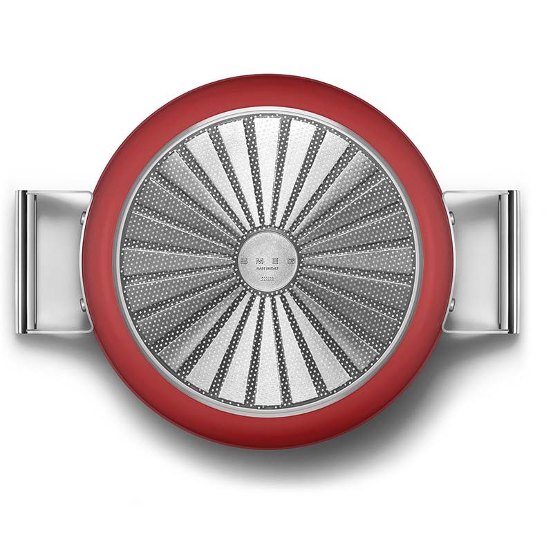 Cacerola baja antiadherente con tapa Smeg 50's Style de 28 cm de diámetro, cuerpo de aluminio forjado y acabado exterior rojo mate.