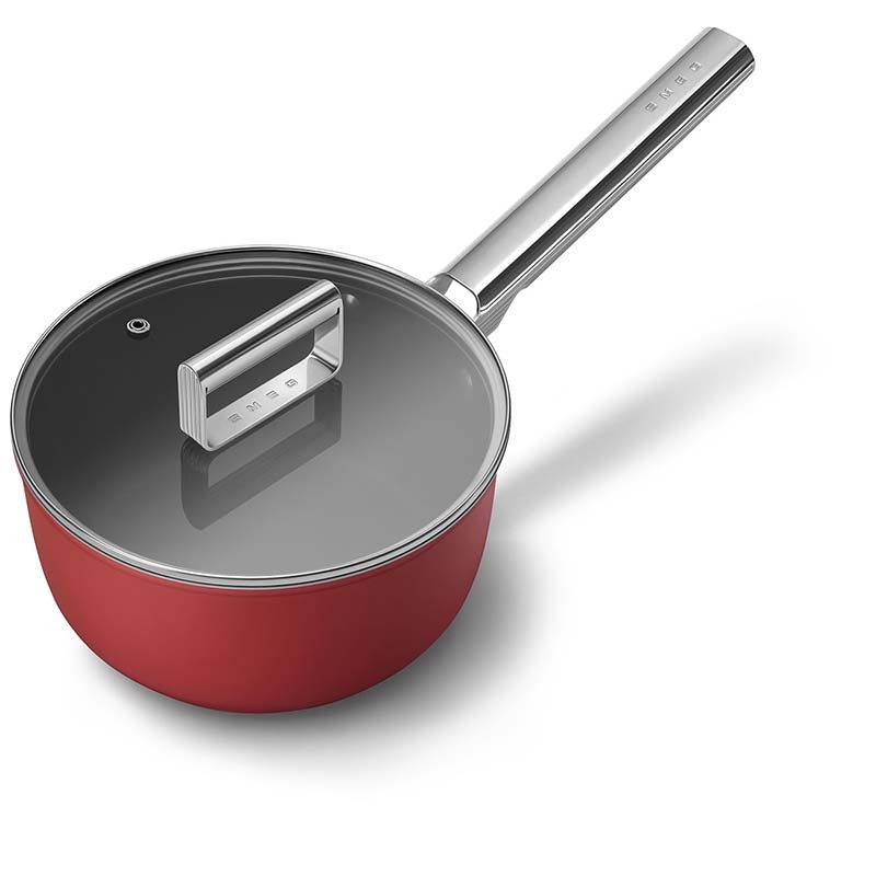Cazo antiadherente con tapa Smeg 50's Style de 20 cm de diámetro, cuerpo de aluminio forjado y acabado exterior rojo mate.