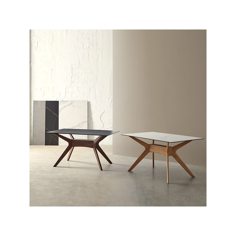 Mesa fija ELOISE elegante y duradera, con tapa de porcelánico y cristal templado. Ideal para reuniones familiares, resistente y fácil de limpiar.